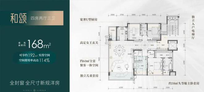 【四房两厅三卫】建筑面积约:168㎡;实得面积约:192㎡;实际得房率114%;相当于旧规226㎡!(旧规户型按85%得房率计算,仅供参考)