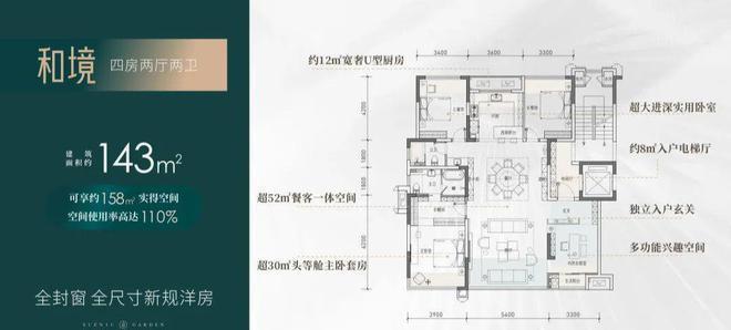 【四房两厅两卫】建筑面积约:143㎡;实得面积约:158㎡;实际得房率110%;,相当于旧规186㎡!(旧规户型按85%得房率计算,仅供参考)