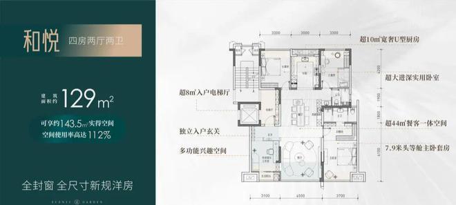 【四房两厅两卫】建筑面积约:129㎡;实得面积约:143.5㎡;实际得房率112%;,相当于旧规169㎡!(旧规户型按85%得房率计算,仅供参考)