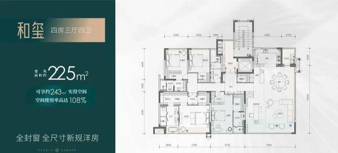【四房两厅四卫】建筑面积约:225㎡;实得面积约:243㎡;实际得房率108%;相当于旧规286㎡!(旧规户型按85%得房率计算,仅供参考)