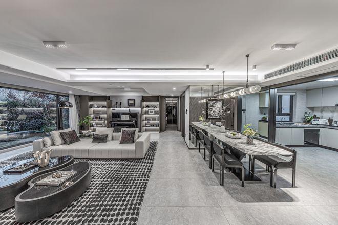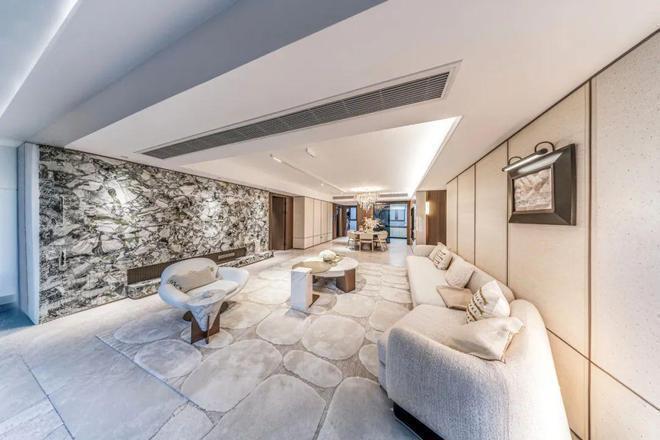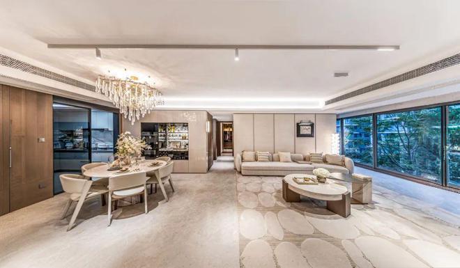 ○巨幕社交空间:超50㎡的社交奢厅,打通约8.6m南向极幕阳台,LDK一体化公区可容纳宴会、会客等多元场景,承载家族社交主场。